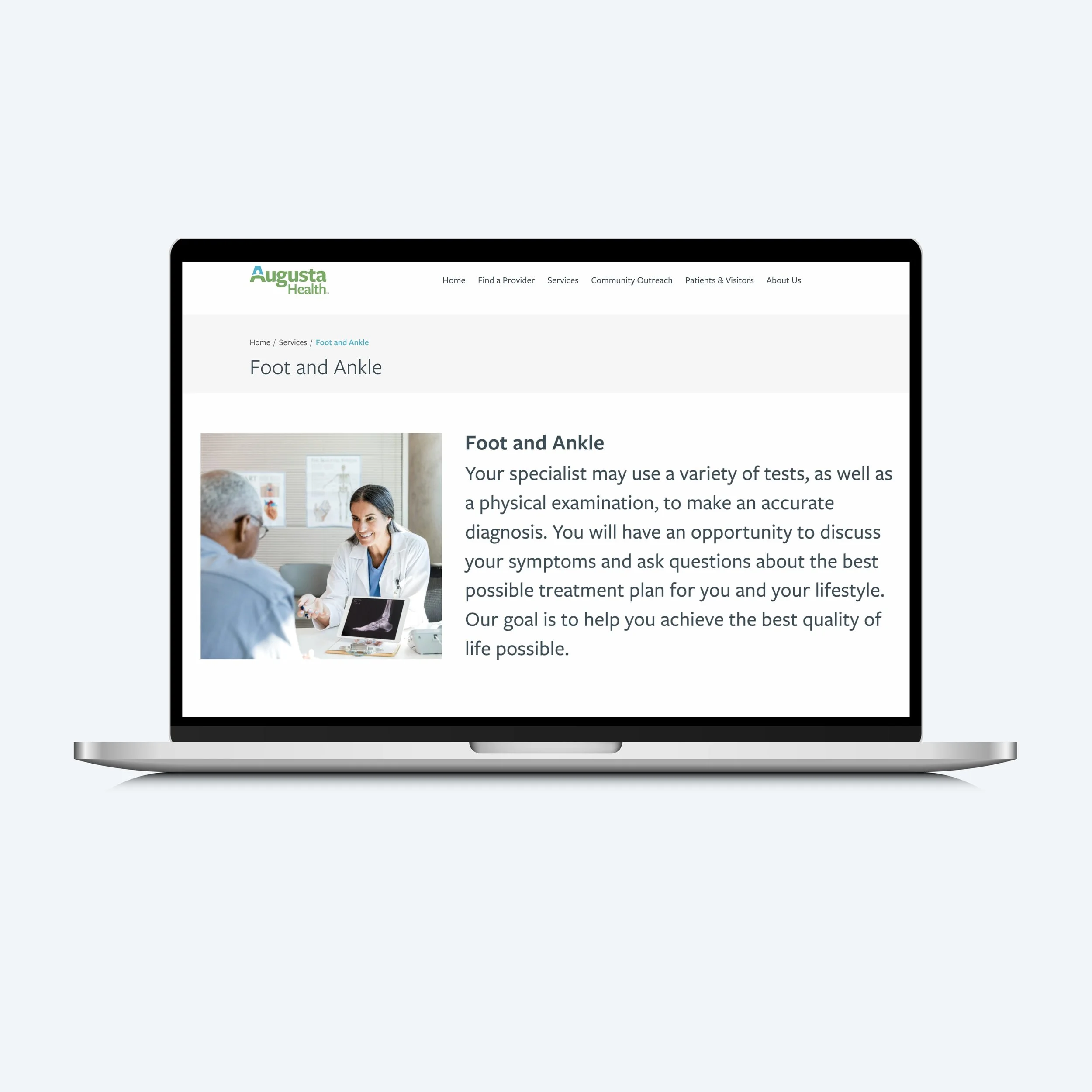Augusta Health’s mission is “to strengthen the health and well-being of all people in our communities.” To that end, they wanted the copy on their site to be written and organized so that patients can find the information they need as easily as possible. They also wanted it to reflect the combination of world-class care and small-town hospitality that makes them unique.